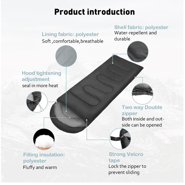 4 সিজন আউটডোর ওয়াটারপ্রুফ এনভেলপ টাইপ স্লিপিং ব্যাগ। আউটডোর অ্যাডভেঞ্চারের জন্য আপনার চূড়ান্ত সব-আবহাওয়া সুরক্ষা। এই উচ্চ-মানের খামের স্লিপিং ব্যাগটিতে উচ্চতর জলরোধী নির্মাণ বৈশিষ্ট্য রয়েছে, চারটি ঋতু জুড়ে আরাম এবং উষ্ণতা নিশ্চিত করে। বিভিন্ন জলবায়ু পরিস্থিতিতে ক্যাম্পিং এবং হাইকিংয়ের জন্য আদর্শ।