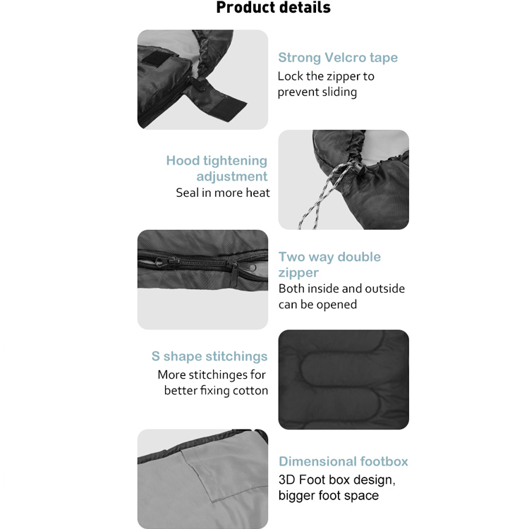 প্রশস্ত খাম-শৈলীর আকৃতিটি উদার লেগরুম অফার করে এবং ঘুমের সময় আরামদায়ক চলাচলের অনুমতি দেয়, যখন এরগনোমিক হুড ডিজাইন মাথা এবং কাঁধের চারপাশে উন্নত তাপ ধারণ করে।