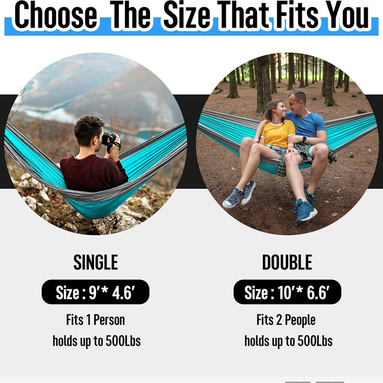 ক্যাম্পিং হ্যামক ডাবল এবং একক পোর্টেবল হ্যামক। আউটডোর অ্যাডভেঞ্চারের জন্য আপনার চূড়ান্ত বহুমুখী শিথিলকরণ ব্যবস্থা। এই ক্যাম্পিং হ্যামক এর অভিযোজিত ডিজাইনের সাথে ডাবল এবং একক উভয় ব্যবহারকারীকে মিটমাট করে। পেশাদার গাছের চাবুক দিয়ে সম্পূর্ণ, এই লাইটওয়েট নাইলন প্যারাসুট হ্যামক সর্বোচ্চ আরাম এবং বহনযোগ্যতা প্রদান করে।