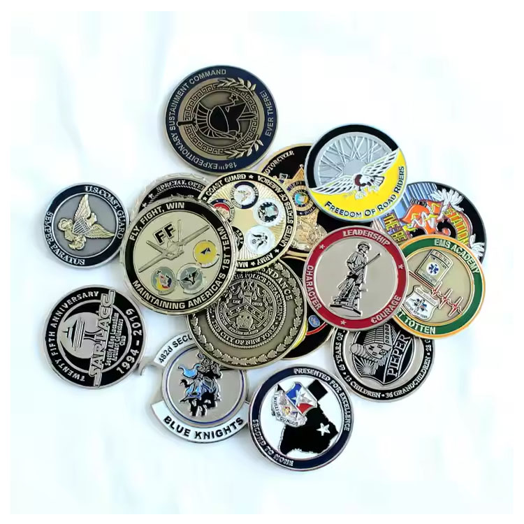 প্রাচীন, পালিশ বা ম্যাট সমাপ্তিতে উপলভ্য, এই কয়েনগুলি প্রান্ত খোদাই বা আলংকারিক সীমানা সহ একক বা ডাবল-পার্শ্বযুক্ত ডিজাইন করা যেতে পারে। যোগ করা ভিজ্যুয়াল প্রভাবের জন্য স্যান্ডব্লাস্টেড টেক্সচার, উত্থাপিত/ রিসেসড এফেক্টস বা গ্লো-ইন-দ্য ডার্ক এনামেল থেকে চয়ন করুন।