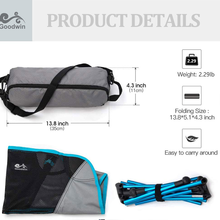 আল্ট্রা-লাইটওয়েট পোর্টেবল কমপ্যাক্ট ফোল্ডিং ক্যাম্পিং চেয়ার। এই আল্ট্রা-লাইটওয়েট পোর্টেবল ফোল্ডিং চেয়ারের সাথে যেকোনো জায়গায় আরাম উপভোগ করুন। কমপ্যাক্ট এবং সহজ স্টোরেজ ব্যাগের সাথে বহন করা সহজ, এটি সমুদ্র সৈকত ভ্রমণ, ক্যাম্পিং, ব্যাকপ্যাকিং, হাইকিং বা যেকোন আউটডোর অ্যাডভেঞ্চারের জন্য উপযুক্ত যেখানে আরাম সুবিধার সাথে মিলিত হয়।