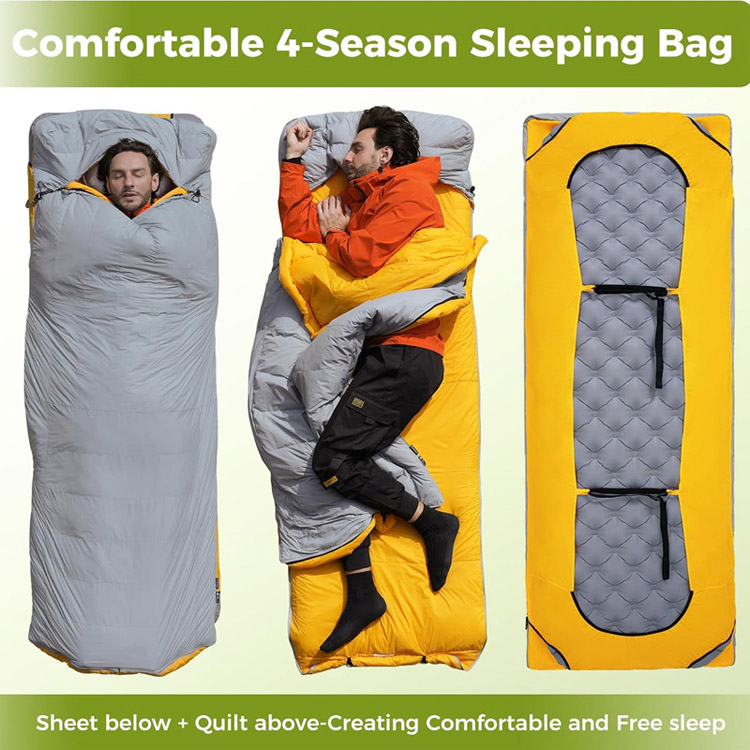 প্রথাগত মমি ব্যাগ থেকে অনায়াসে রূপান্তরিত করে বহুমুখী টপকুইল্টে পূর্ণ-দৈর্ঘ্যের পৃথককারী জিপার ব্যবহার করে, বিভিন্ন ঘুমের পছন্দগুলিকে মিটমাট করে এবং পরিবর্তনশীল তাপমাত্রার সময় নমনীয় কভারেজ প্রদান করে।
