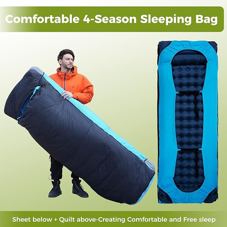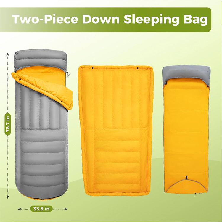 আল্ট্রালাইট ডাউন ক্যাম্পিং ব্ল্যাঙ্কেট ডাক ডাউন স্লিপিং প্যাড। ওয়াইল্ডারনেস অ্যাডভেঞ্চারের জন্য আপনার চূড়ান্ত ফোর-সিজন স্লিপ সিস্টেম। এই আল্ট্রালাইট ডাউন স্লিপিং ব্যাগটি একটি ইন্টিগ্রেটেড ইনফ্ল্যাটেবল প্যাডের সাথে প্রিমিয়াম ডাক ডাউন ইনসুলেশনকে একত্রিত করে। টপকুইল্ট এবং স্লিপিং ব্যাগ উভয় হিসাবে কাজ করে, এটি ওজনে আপস ছাড়াই সর্বাধিক উষ্ণতা প্রদান করে।